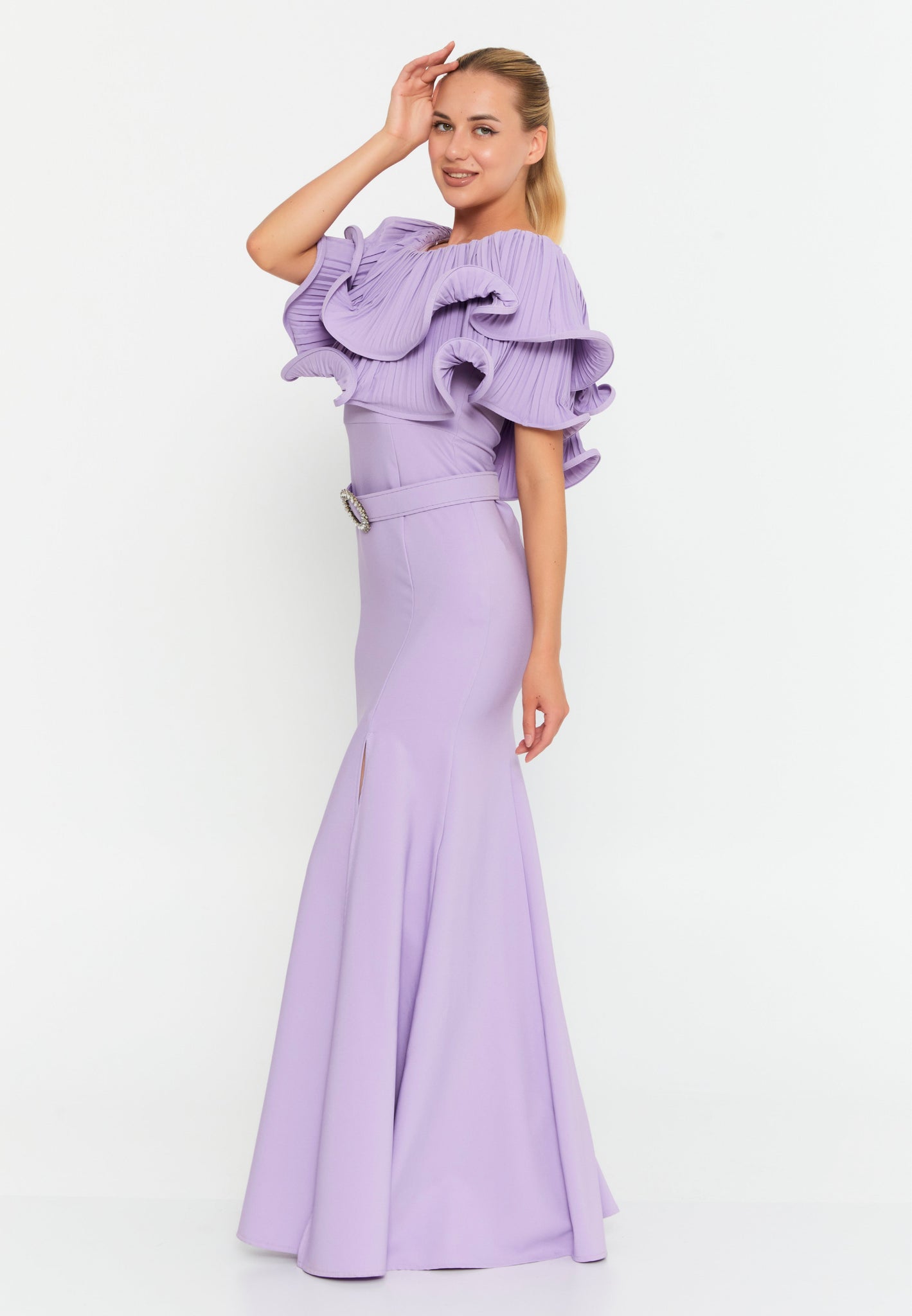 This elegant floor-length gown is designed to impress with its unique layered ruffle cape detail. The sculptural ruffle neckline beautifully frames the shoulders, adding volume and a touch of romance, while creating a graceful and commanding silhouette.