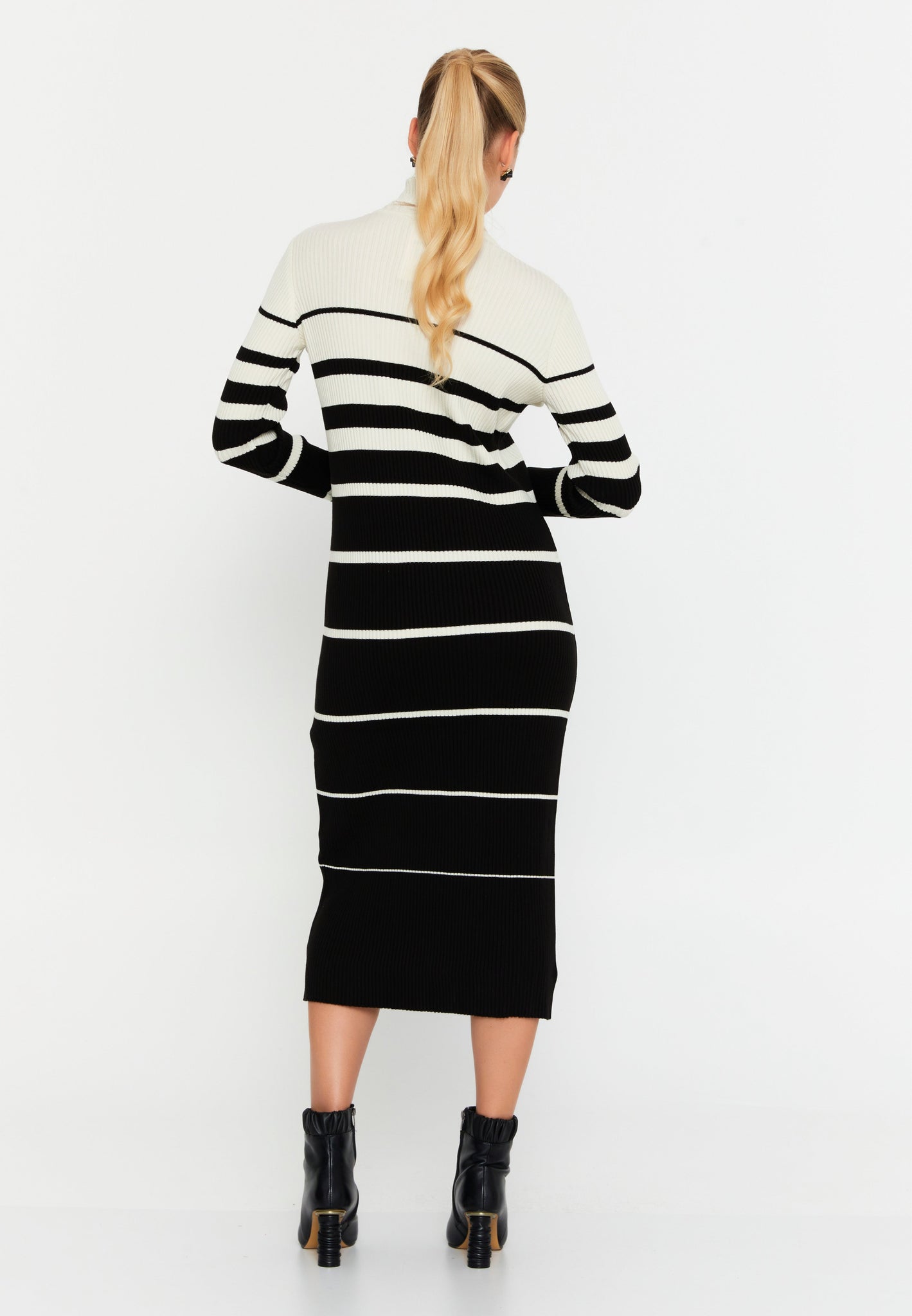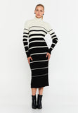 This knitted midi dress blends timeless simplicity with modern elegance, featuring a classic stripe pattern that adds both sophistication and style. The high-neck design enhances the overall silhouette while providing warmth and comfort for cooler seasons. Long sleeves create a balanced look, flattering the arms while adding practicality.
