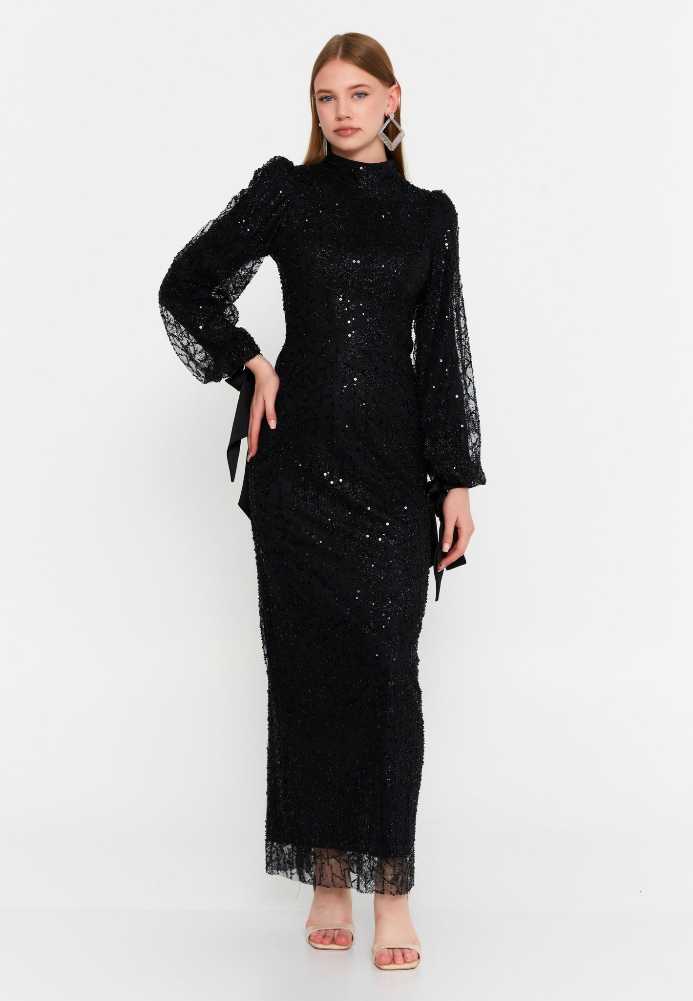This evening gown features a sophisticated high neckline and a slim-fit silhouette, exuding elegance and confidence. The long sleeves are delicately finished with lace details, adding a subtle sheer effect that enhances feminine charm and mystery.