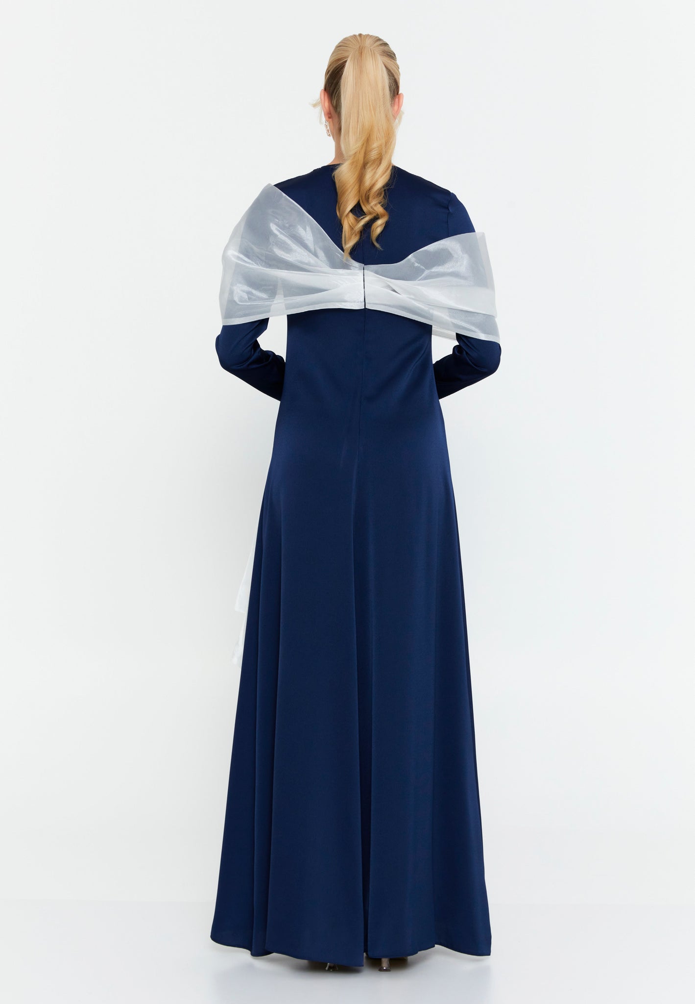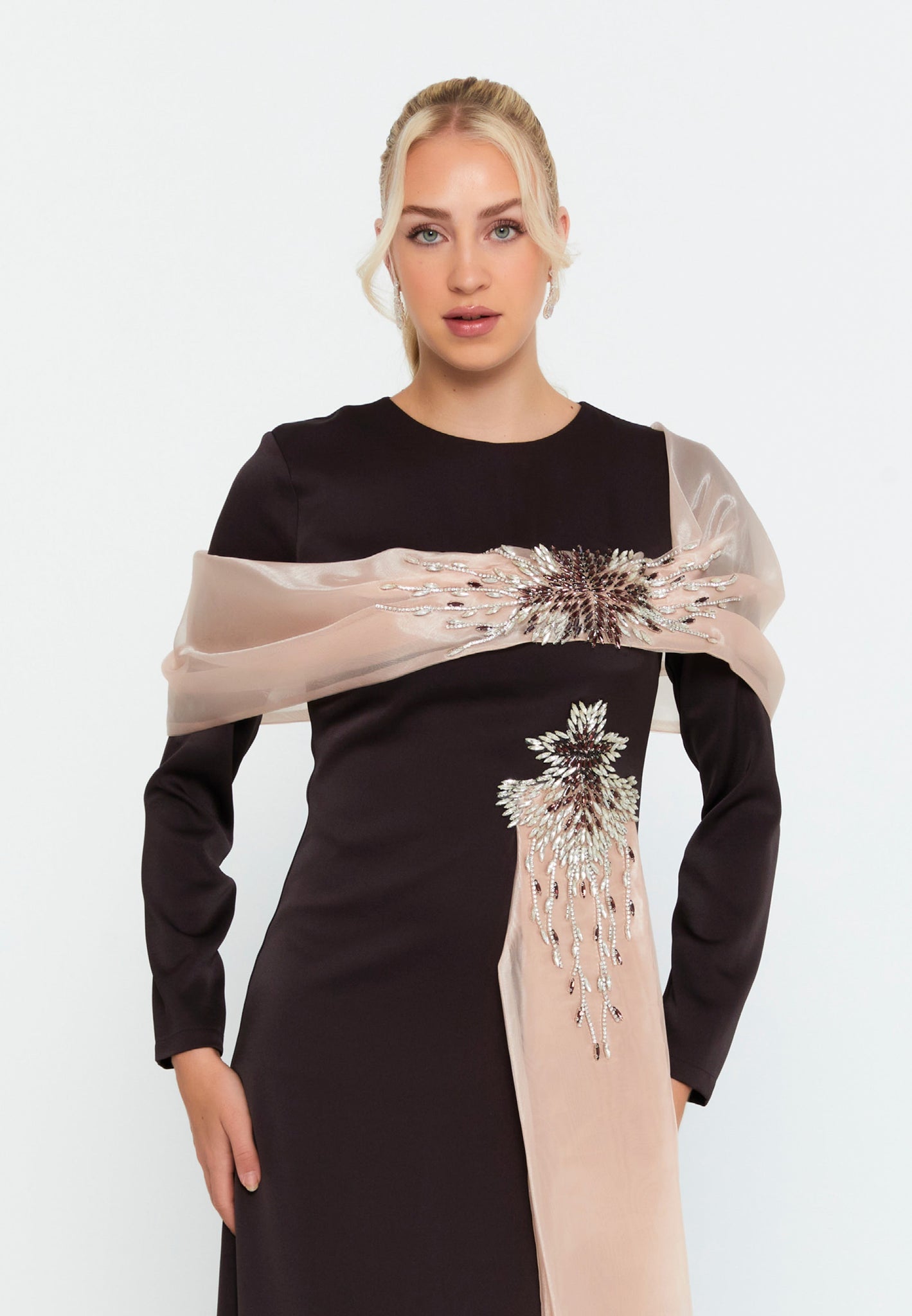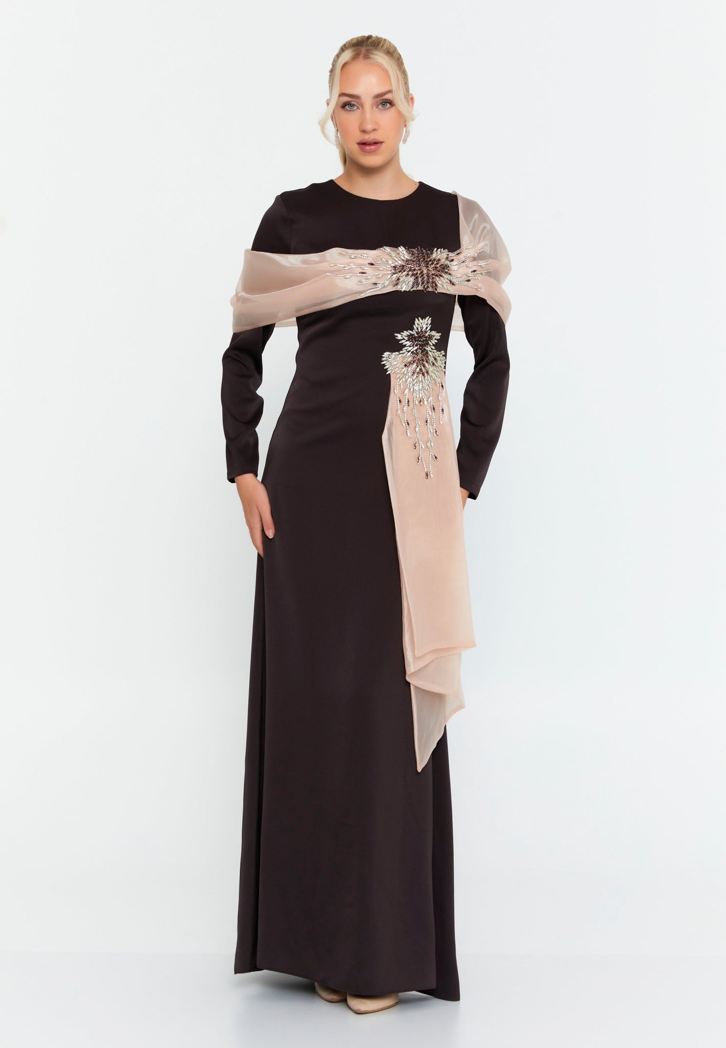 This elegant evening gown combines simplicity with dramatic detailing, designed to highlight femininity and sophistication. The slim-fit cut accentuates the body’s curves, while the long sleeves add modesty and grace, making it ideal for formal settings.