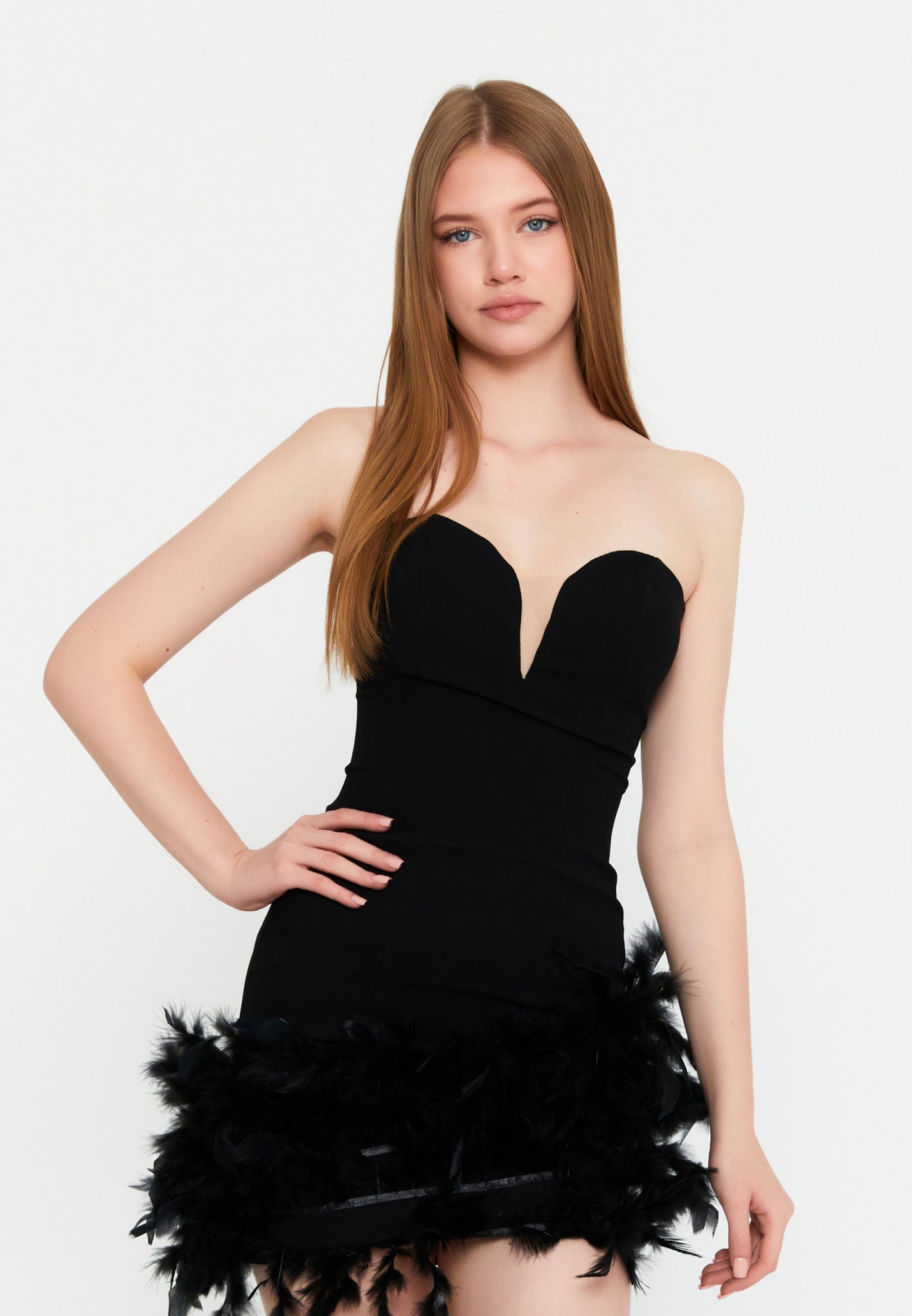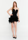 This strapless mini dress with feather embellishments is designed to combine bold sensuality with refined elegance. The strapless cut beautifully highlights the shoulders and collarbone, while the sweetheart neckline adds a romantic and feminine touch, creating a flattering and eye-catching silhouette.