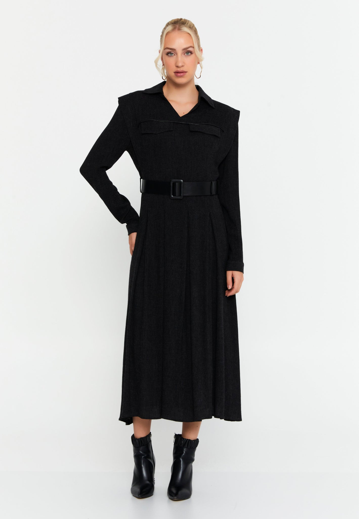 The dress comes with a matching belt at the waist, cinching the figure and enhancing proportions for a slimming effect. The midi-length skirt drapes naturally, flattering the legs and offering both comfort and elegance. With structured tailoring, this dress pairs beautifully with ankle boots or heels, showcasing confidence and sophistication.